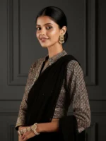 Our 2-piece black fusion georgette pre-draped saree set features an embroidered crop top blouse with a mandarin notched neckline and three-quarter sleeves. Complemented with stylish dhoti pants, this chic style is perfect for festive celebrations.