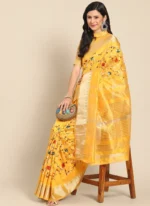 Step into the realm of timeless elegance with this exquisite Pink Assam Cotton Silk Saree meticulously crafted to captivate hearts and turn heads. The soft yet opulent fabric a fusion of Assam cotton and silk drapes gracefully offering comfort without compromising on sophistication. The delicate thread embroidery work adorning this saree adds an enchanting allure evoking a sense of traditional charm blended seamlessly with contemporary finesse. Each intricate detail speaks volumes about the skilled craftsmanship and dedication poured into its creation making it a true masterpiece. Accentuating its beauty is the temple contrast border a hallmark of South Indian craftsmanship which adds a regal touch to the ensemble. The juxtaposition of vibrant hues against the serene pink background creates a mesmerizing contrast elevating its allure to new heights. Perfect for exclusive soires and grand occasions this saree exudes an aura of exclusivity and sophistication making it an ideal choice for those who seek to make a statement with their attire. Whether its a lavish party or a cultural celebration this saree ensures you stand out with poise and grace. Embrace the timeless charm of Indian heritage while embracing modern sensibilities with this exclusive party wear saree. Its not just a garment its a testament to the rich cultural tapestry and the enduring legacy of Indian craftsmanship. Flaunt your style with confidence and grace as you adorn yourself in this resplendent attire destined to leave a lasting impression wherever you go.