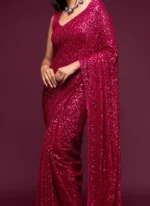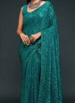 Make the heads turn whenever you dress up in this dark green color georgette saree. This saree is displaying some wonderful work done with embroidered and sequins work look chic. This saree comes with unstiched dark green color georgette blouse.