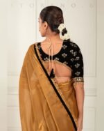 - Black Velvet Embroidered Blouse Embellished With Golden Zari And Sequins Work,Adding Black And Golden Border And Beads.