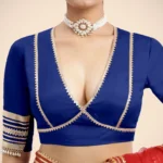 Nafeeza x Tyohaar | Cobalt Blue Embellished Elbow Sleeves FlexiFi Saree Blouse with Plunging V Neckline with Tasteful Royal Blue Gota Lace