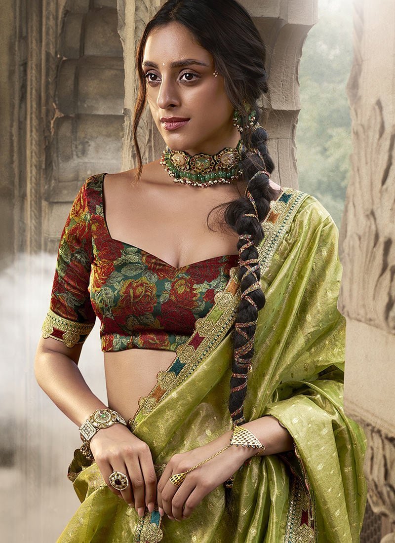 Home Saree Pista Green Tissue Jacquard Zari Saree Festive Wear