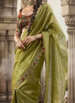• This pista green tissue saree is crafted with fine jacquard weaving enriched with traditional zari work. The fabric has a soft sheen that reflects light beautifully while maintaining a lightweight drape for all day comfort. The embroidered sequins along the border add a touch of shimmer and elegance making the saree perfect for festive occasions. The lace edging frames the saree neatly accentuating its refined detailing. This harmonious blend of pista green and olive green tones makes it a refreshing choice for both daytime and evening celebrations.