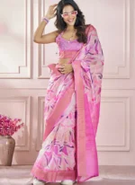 - The saree comes paired with a Pink Soft Silk Printed Zari Woven Blouse designed to complement the sarees elegance. The blouse can be customized to your preferred style whether its a classic round neck a bold Vneck or even a chic sleeveless design. This customization option allows you to tailor the outfit to suit your personality and the occasion.